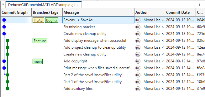 This example shows how to create a linear commit history using Git™ rebase in MATLAB®.