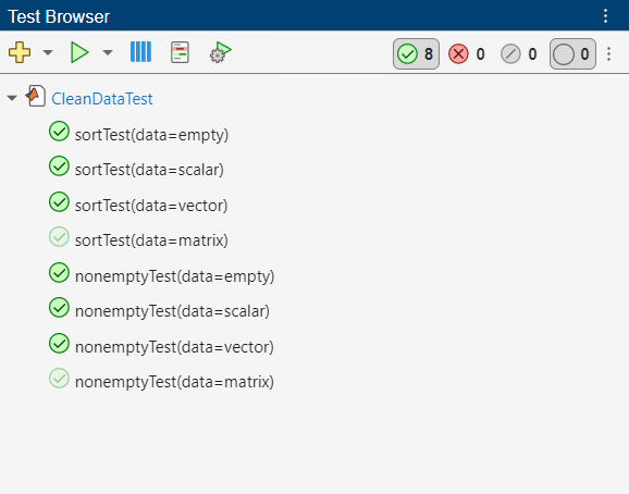 To run the remaining tests, click the Not Run button on the toolbar. Then, click the Run current suite button . After running the tests, view the test results by clicking the Passed button on the toolbar. The statuses of tests that ran before the most recent test run appear dimmed in the Test Browser panel. (since R2025a)