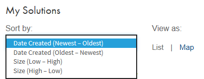 To view all of your solutions, go to an Assessment Item page and click View my solutions. You can view your solutions in a list or in the Solution Map. If using the list view, you can review the display by selecting a Sort by option. Options are date created (newest-oldest, which is the default), date created (oldest-newest), size (low-high), and size (high-low).
