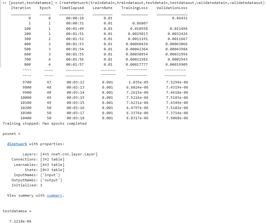 You can also use the analyzeNetwork function from Deep Learning Toolbox to visualize and understand the architecture of the trained ARNN (posnet). You can also use this utility function to check if the architecture of the trained ARNN is correct and detect problems (if any).
