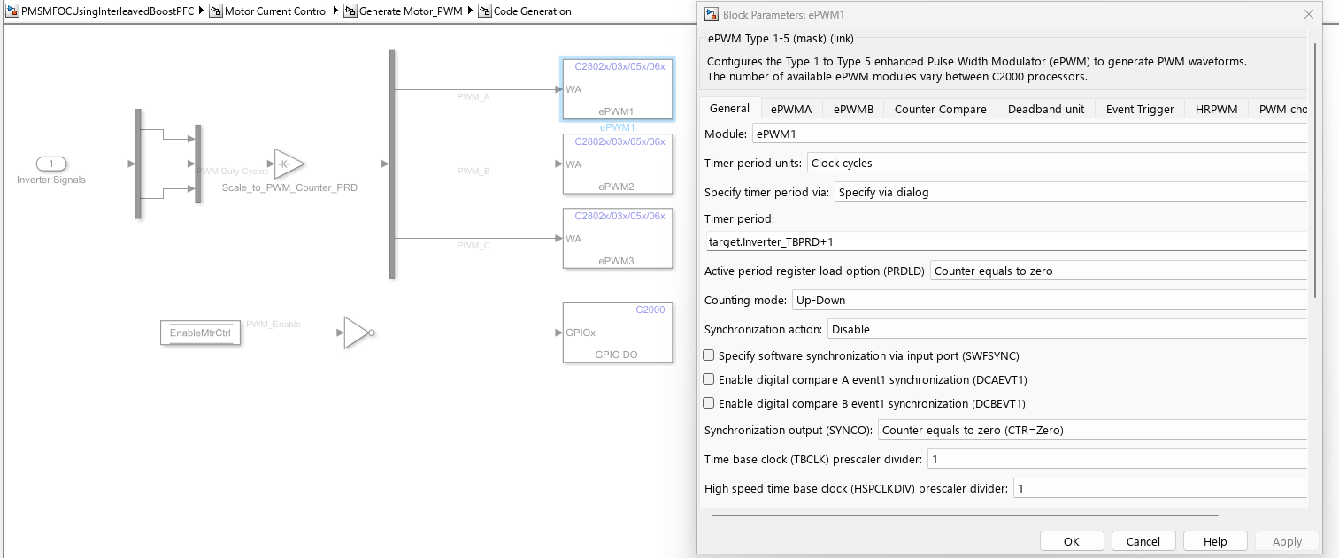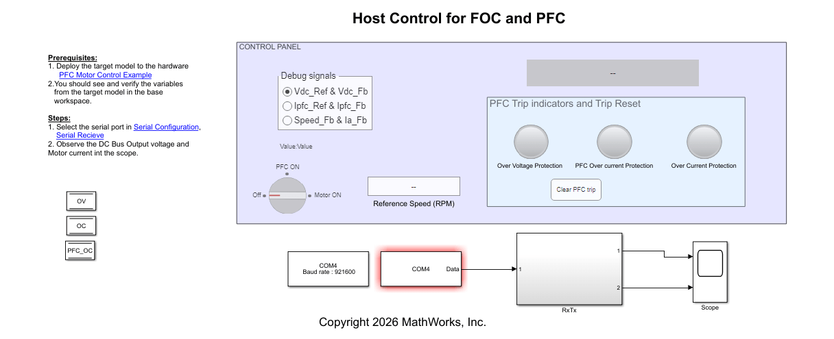 PMSMFOCUsingInterleavedBoostPFC— Simulate, generate code, and load it on the F28069M controlCARD for Motor Load model.PMSMFOCUsingInterleavedBoostPFCHost— Runs on the host computer to log signals for Motor Load Host model.