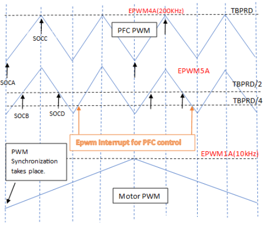 The PWM signals are generated at a frequency of 200 kHz. The ePWM4 module is configured to operate in up-down count mode. All ADC results are read in (100kHz) ISR labeled PFC_ISR. This ISR is triggered by ePWM4 on every second of CMPB (with a preset value) match event during down count, so that the ISR is triggered only after the ADC conversions are complete.