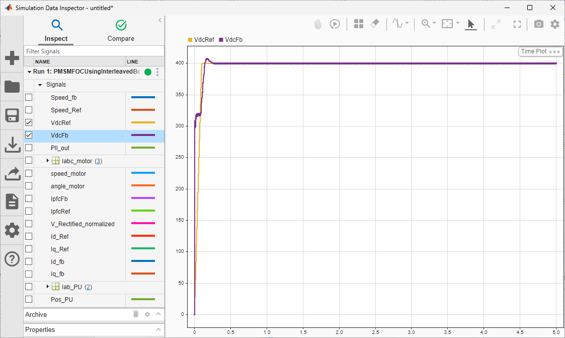 PMSMFOCUsingInterleavedBoostPFCmodel, and click the Run button to simulate the model.To observe the results, open Data Inspector to visualize signals.