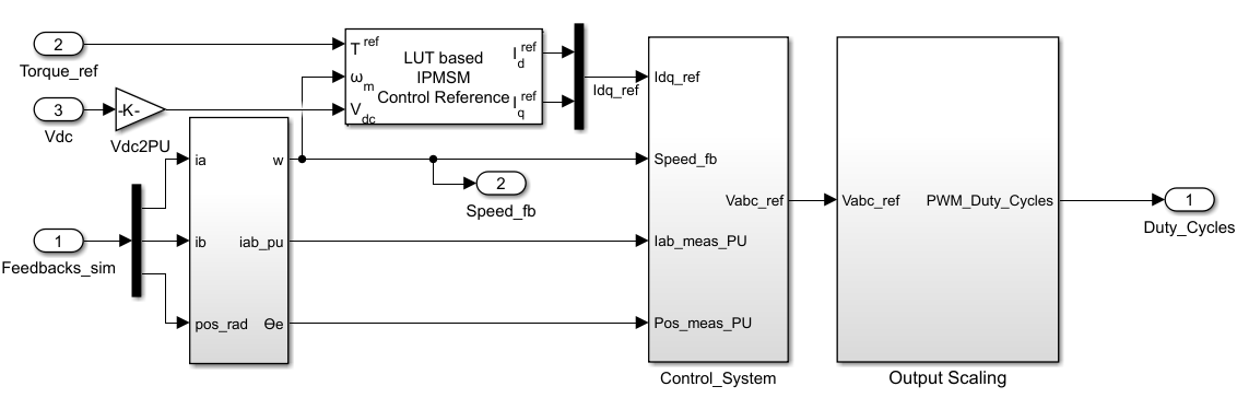 The following figure shows the part of the model that is used to simulate the motor control, and shows the LUT based PMSM Control Reference block that feeds reference currents to inner loop implemented as PID controller.