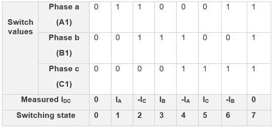 The controller operates the inverter in a complementary mode. The pulse that controls the lower transistor in an inverter leg is always opposite to the one controlling the upper transistor. Therefore, the upper-transistors of a three-phase inverter can have eight switching states (for space vector modulation PWM) described in the following table.