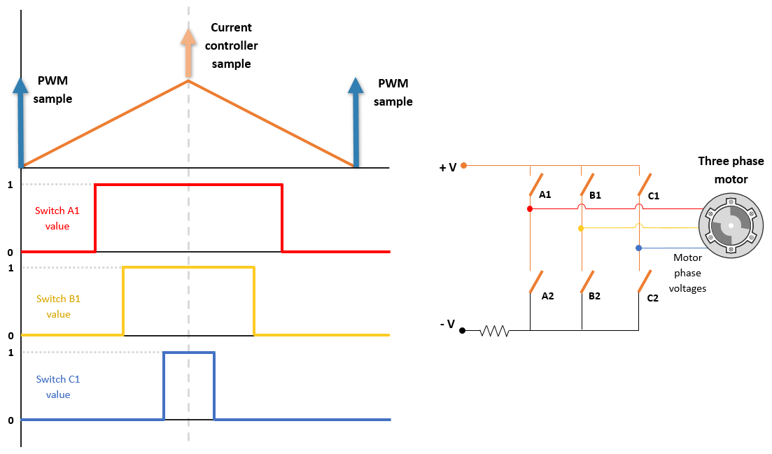 To generate PWM duty cycles, the current controller uses a triangular carrier waveform with a specific sampling time and generates three pulse trains that operate the inverter switches as shown in the following figure.