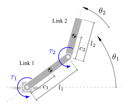 The state of the system consists of the joint angles and angular velocities .The system has one control input, . The dynamics of the system are derived using Euler-Lagrange equations and include inertial, Coriolis, and gravitational terms.
