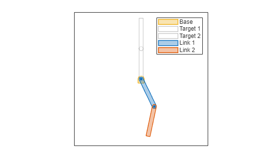 hPlot = RobotEnvironment( ... Length1 = pvstate(3), ... Length2 = pvstate(3)); % Set Initial angular position and desired state. hPlot.Theta1 = x0(1)-pi/2; hPlot.Theta2 = x0(2); hPlot.xf = xref - [pi/2;0;0;0];