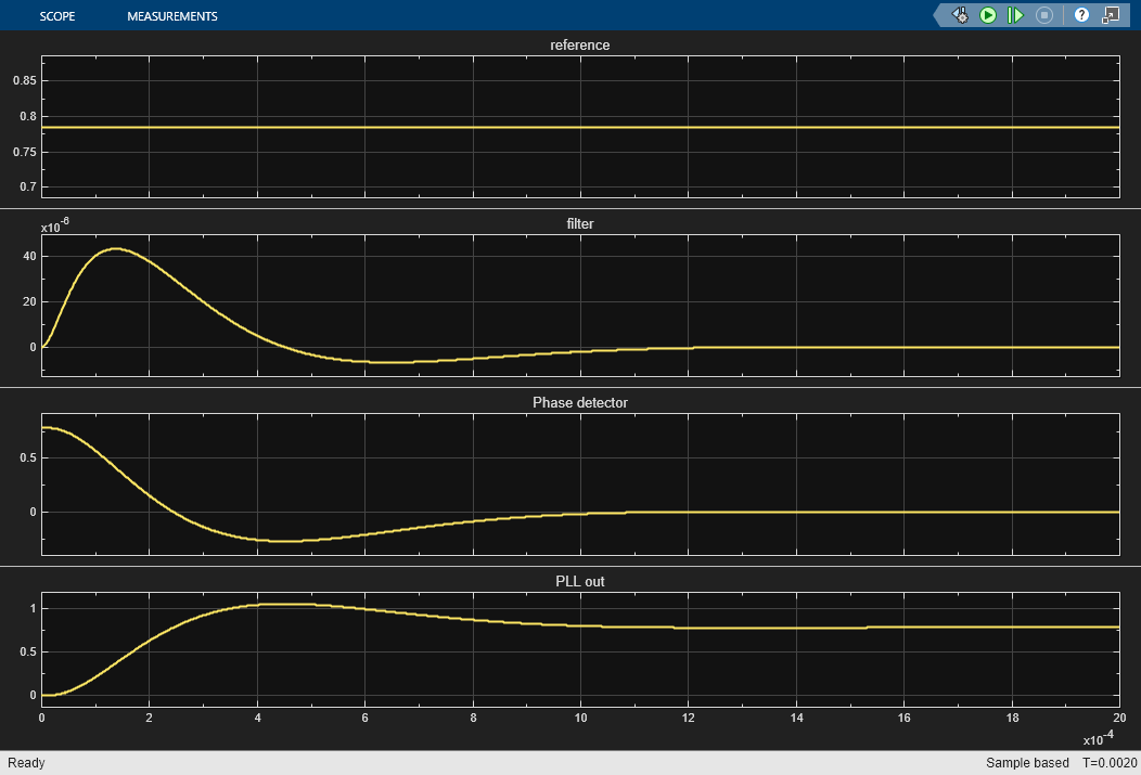 The Baseband PLL block models PLLs in the phase domain. The block accepts a real-valued phase offset vector and produces the outputs for a loop filter, phase detector, and VCO. The block acts as feedback control system that automatically adjusts the phase of a locally generated signal to match the phase of an input signal.
