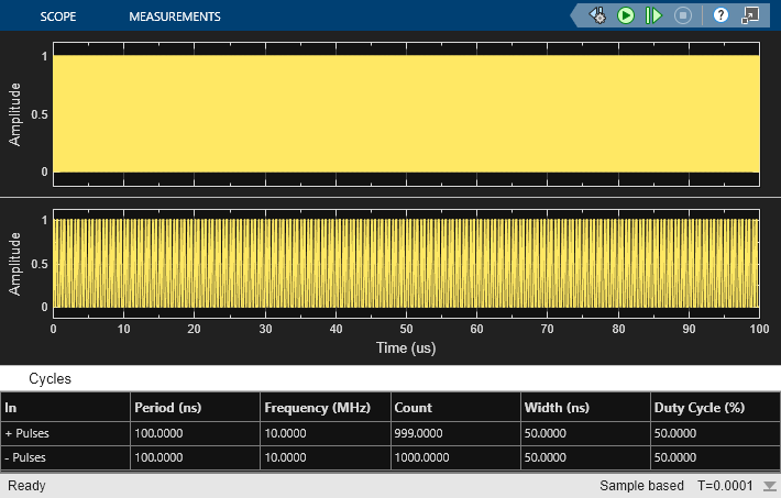 Since the program counter has already sensed S pulses, it requires (P-S) more pulses, or (P-S)N cycles to reach overflow, where P is defined by the Program counter value (P) parameter. The cycle repeats after both counters are reset.