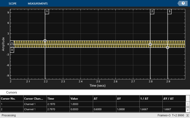scope.CursorMeasurements.LinkToWaveform = false; scope.CursorMeasurements.YLocation = [1 0 -1]; scope(swv)
