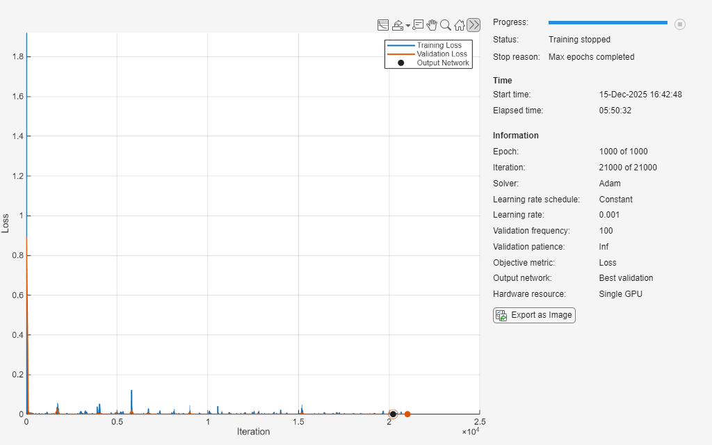 if doTraining [net,info] = trainnet(UTrain,VTrain,layers,"l2loss",options); else fprintf("Downloading network... ") filenameNetwork = matlab.internal.examples.downloadSupportFile("nnet","data/BatteryModuleCoolingNetwork.mat"); load(filenameNetwork) show(info) fprintf("Done.\n") end