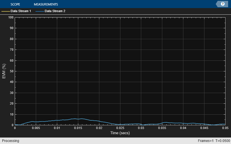 To see how the data signals are impacted by the components in the transmitter and receiver cascades, we use a helper function to visualize the error vector magnitude (EVM) and constellation diagram of the received data streams. See Visualize RF Impairments (Communications Toolbox) for more information on creating the visualizations in this section.