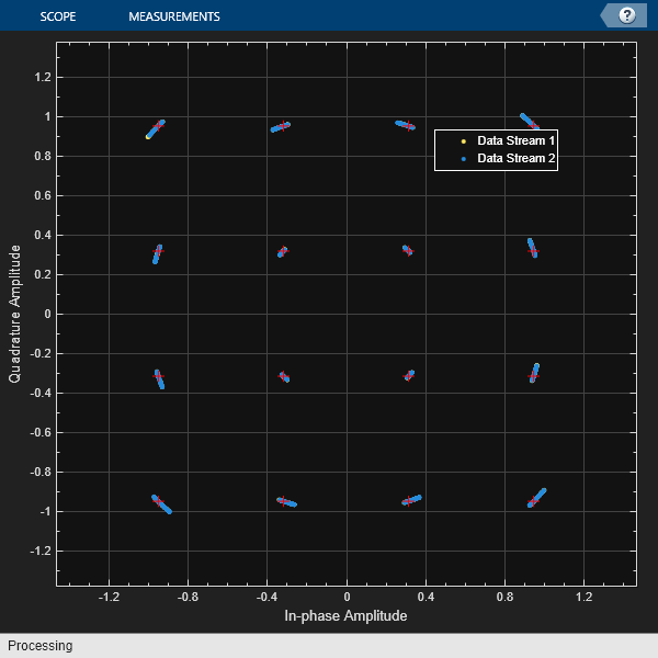 M = 16; refConst = qammod(0:M-1,M,UnitAveragePower=true); data = randi([0 M-1],nSamples,ns); modSig = qammod(data,M,UnitAveragePower=true);