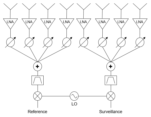 The receiver being used is made up of an 8-element uniform linear array (ULA) with two partially connected sub-arrays. Each element channel has a low noise amplifier (LNA). Each sub-array of four elements is connected through an analog beamformer to a combiner. The combined signal after beamforming passes through filters and then down-conversion mixers with a shared local oscillator (LO). The phase shifter on each beamformer can be set to steer the beams and place nulls in different directions. One of these sub-arrays will serve as the reference channel, and one will serve as the surveillance channel.