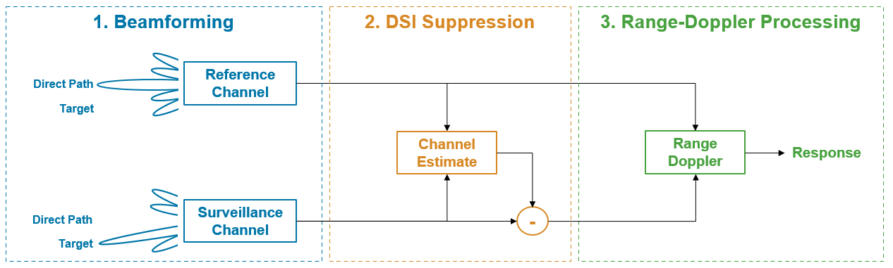 2. Direct Signal Interference (DSI) Suppression: Even with beamforming, the direct path signal power is often orders of magnitude higher than the target returns in the surveillance channel. This step removes the direct path signal from the surveillance channel. For more information on DSI suppression, see Direct Signal Interference (DSI) Suppression In Passive Radar.
