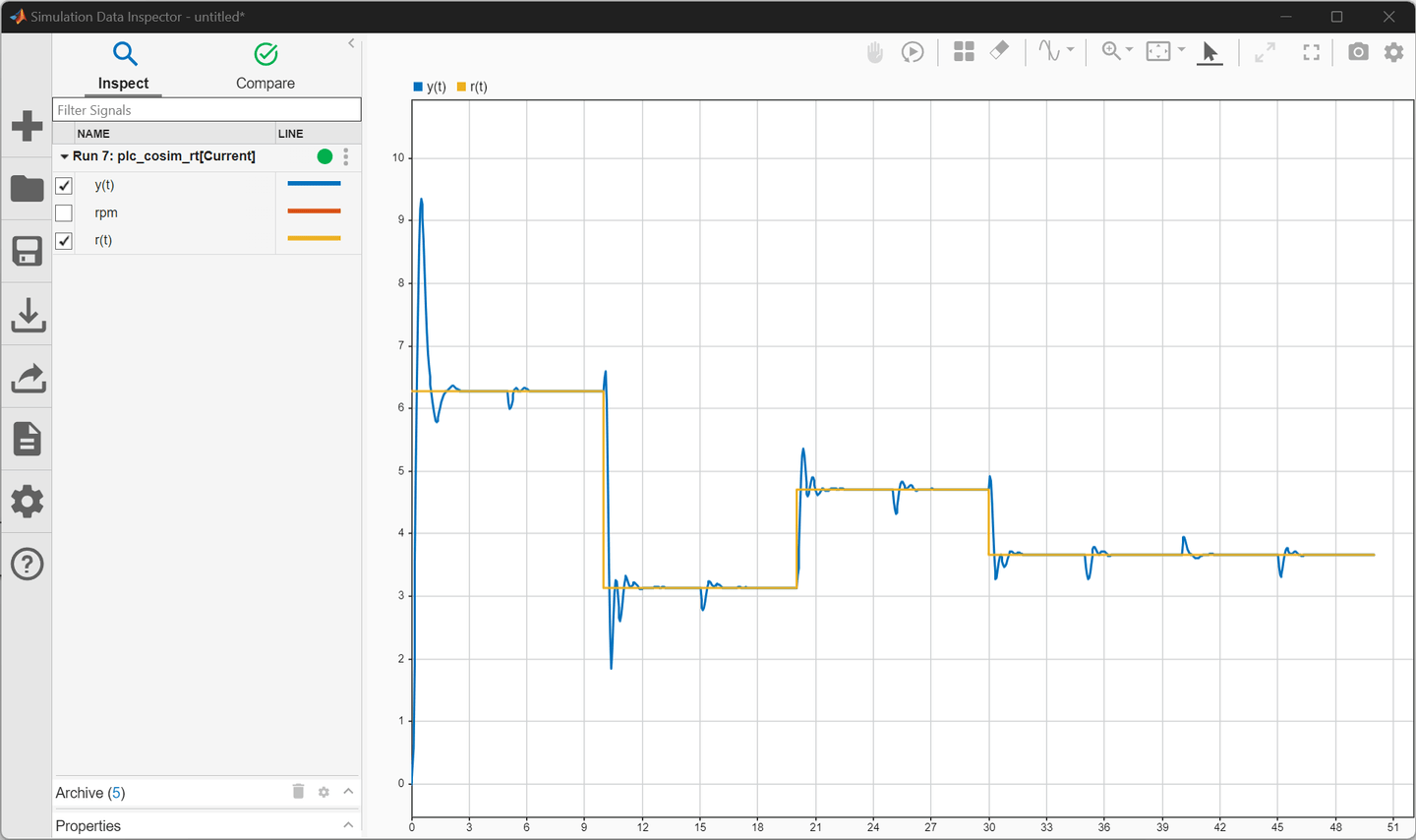 7. After the Simulink model simulation ends, in CODESYS, click Debug > Stop. In Simulink, in the Simulation tab, in the Review Results section, click Data Inspector. Select r(t) and y(t) to observe the co-simulation results.