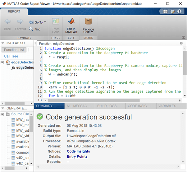 The deploy function initiates code generation of the edgeDetection function. At the end of code generation, MATLAB generates a code generation report. Use this report to debug the edgeDetection function for any build errors and warnings in the generated code.