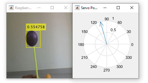 A camera window opens with the ROI and the probability of match with the training network. A separate window opens to display the angle of the servo motor.