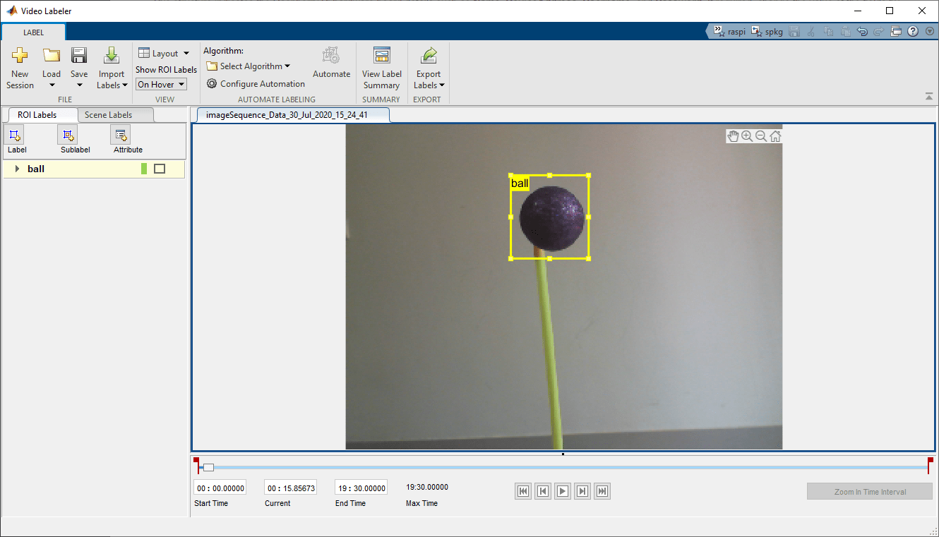 Running the objectTrackingSetup(tracker) command also opens the Video Labeler (Computer Vision Toolbox) app. This app allows you to mark the region of interest (ROI), automatically label across image frames using an automation algorithm, and export the labeled ground truth.