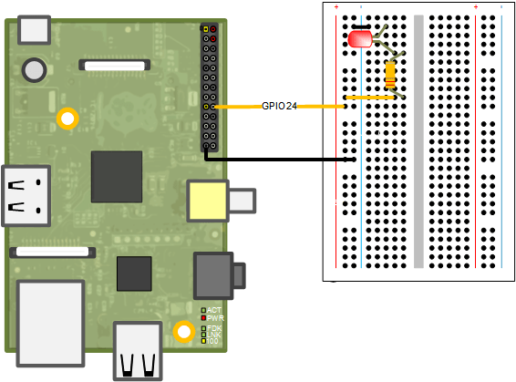 In this example, you connect a red LED across a GPIO pin and turn the LED on and off using the MATLAB command-line interface. You need a red LED and a 330 Ohm resistor. You connect the LED and the resistor as shown in the circuit diagram.