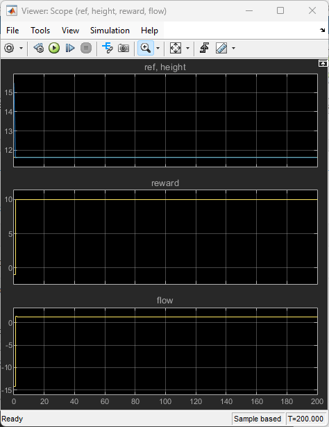 • Stop training when the evaluation score reaches 2000. At this point, the agent can control the level of water in the tank.