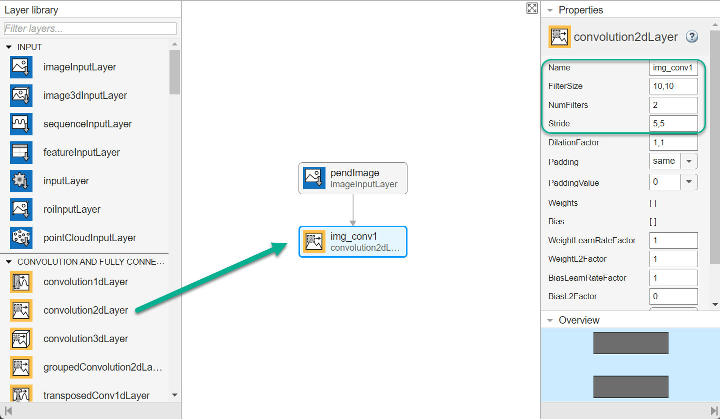 Second, drag a convolution2DLayer to the canvas and connect the input of this layer to the output of the imageInputLayer. Create a convolution layer with 2 filters (NumFilters property) that have a height and width of 10 (FilterSize property), and use a stride of 5 in the horizontal and vertical directions (Stride property).