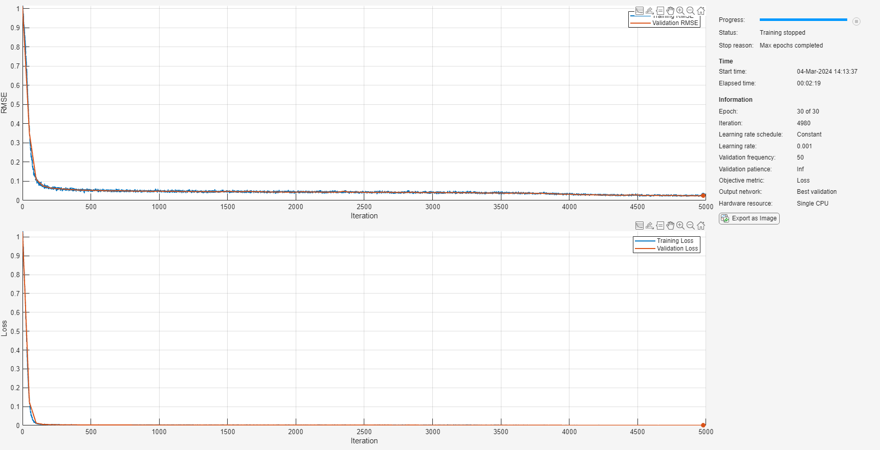 options = trainingOptions("adam", ... Verbose=false, ... Plots="training-progress", ... Metrics="rmse", ... Shuffle="every-epoch", ... MaxEpochs=30, ... MiniBatchSize=512, ... ValidationData=validationCellArray, ... InitialLearnRate=1e-3, ... GradientThresholdMethod="absolute-value", ... ExecutionEnvironment="cpu", ... GradientThreshold=10, ... Epsilon=1e-8);