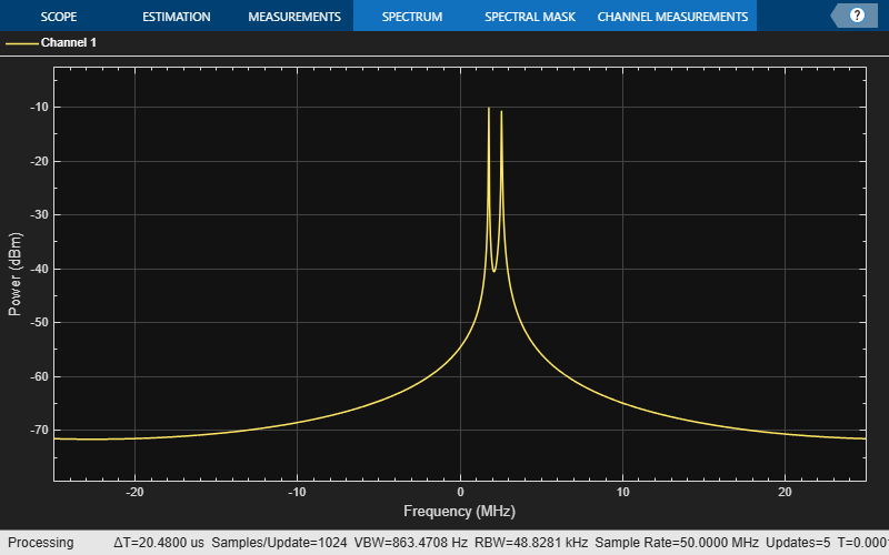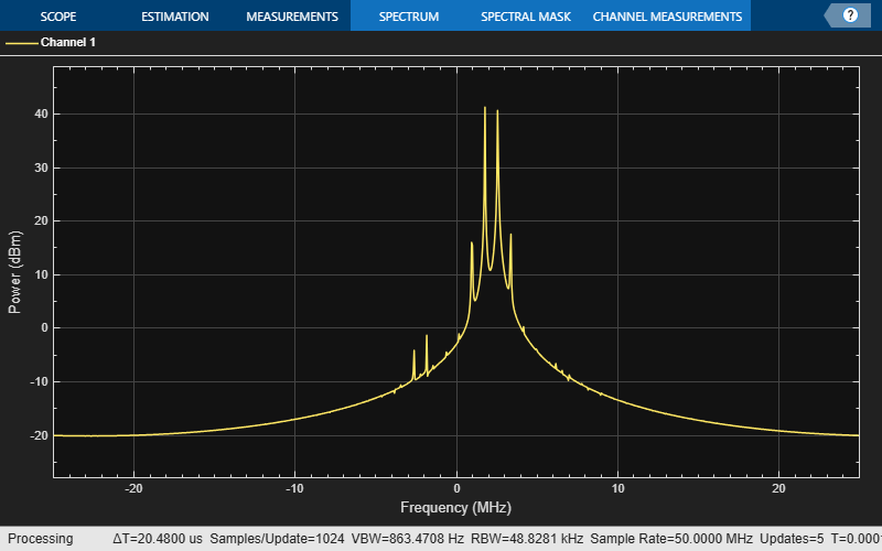 SpectAnal = spectrumAnalyzer('SampleRate',sampleRate,'ShowLegend',true); for Iter = 1:10 sineWave1 = SineObj1(); sineWave2 = SineObj2(); sineIn = m40dB*(sineWave1 + sineWave2); ampIQ = preAmpIQ(sineIn); modIQ = mixerModIQ(ampIQ); paOut = powerAmp(modIQ*sqrt(50))/sqrt(50); SpectAnal(paOut); end