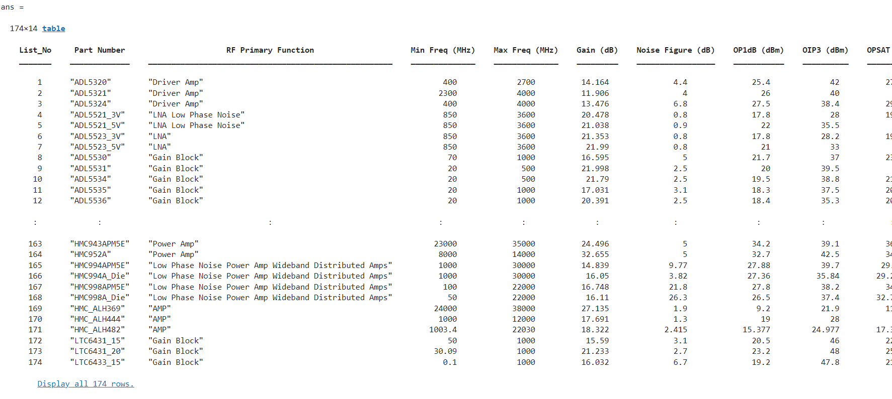 rfps = rfPartSelector(Type='amplifier',Vendor='ADI')