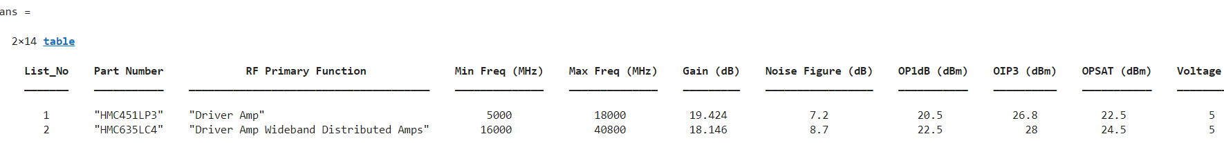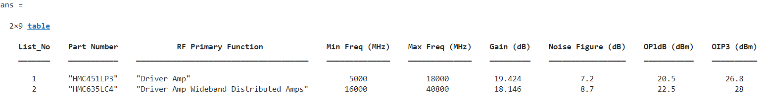 rfp = rfPartSelector(Type='amplifier',Vendor='ADI');