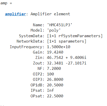 Use the rfPart function to create amplifiers objects. For this example, create an amplifier object for the first amplifier in the table.