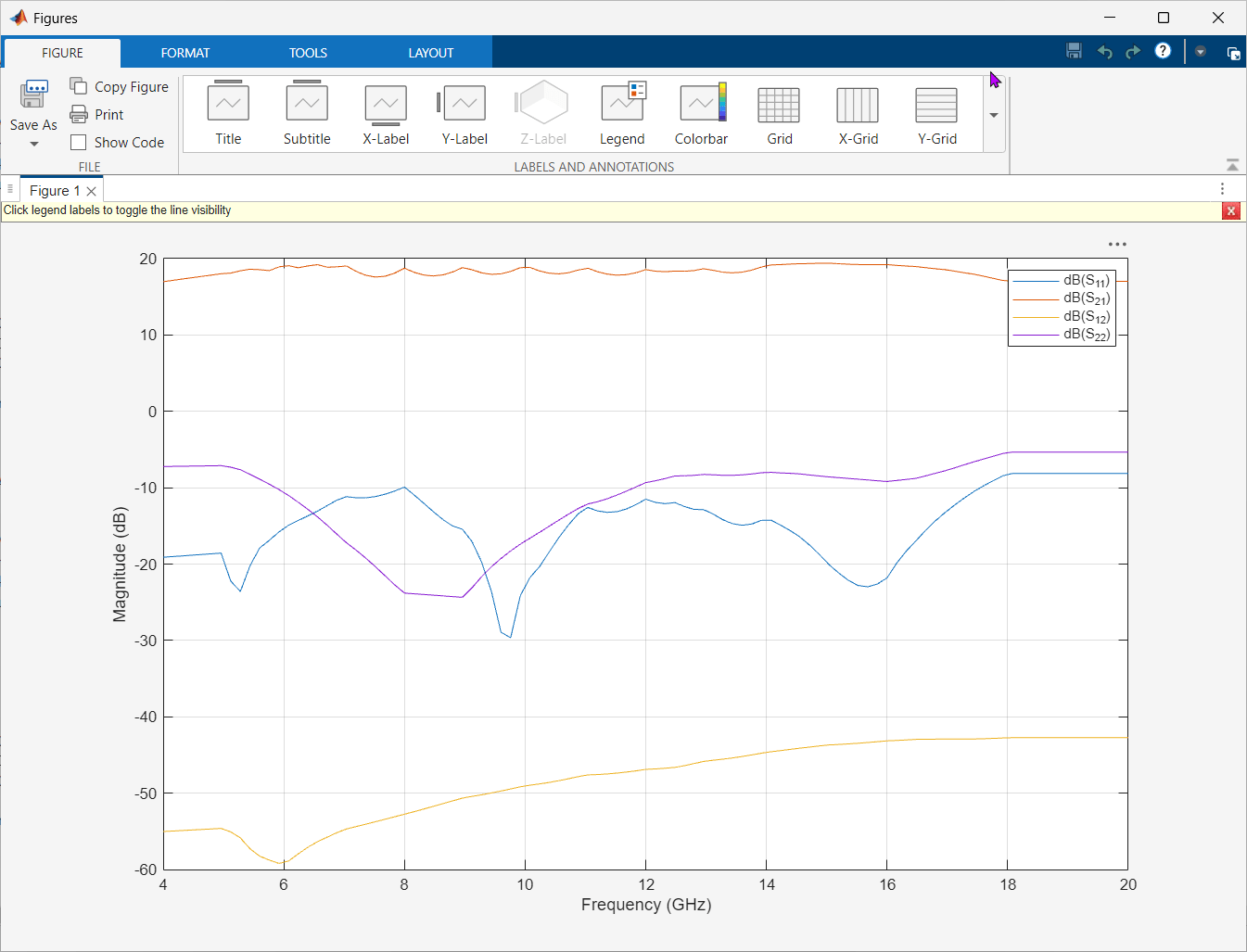 spar = sparameters(amp,linspace(4e9,20e9,101));