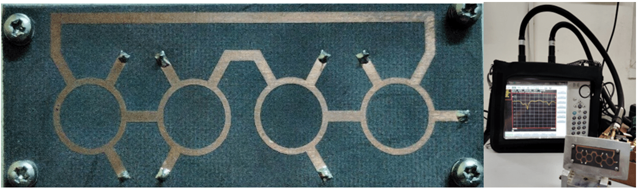 The designed monopulse comparator is fabricated as shown below and it is tested for the reflection coefficient at the sum and difference ports. Reflection coefficient of fabricated antenna array is measured using a Network Analyzer.