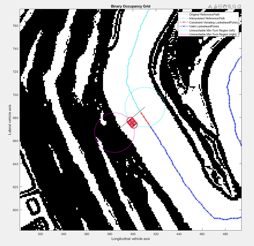 This figure shows an example of the vehicle traveling parallel to the reference path. The red lookahead points on the reference path are invalid because they lie within the unreachable minimum turning radius region, even though they are the closest lookahead points. The blue points are the valid next lookahead points.