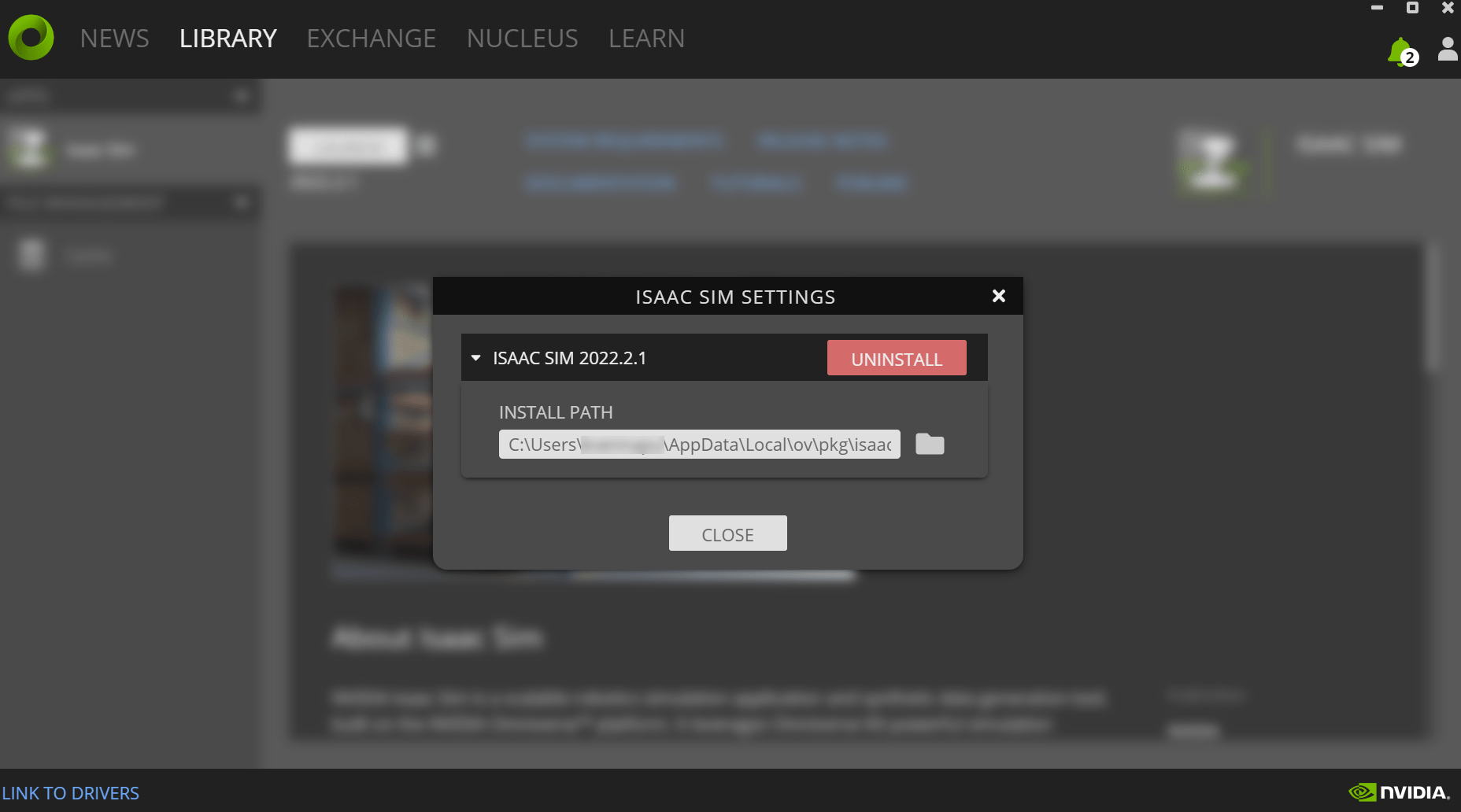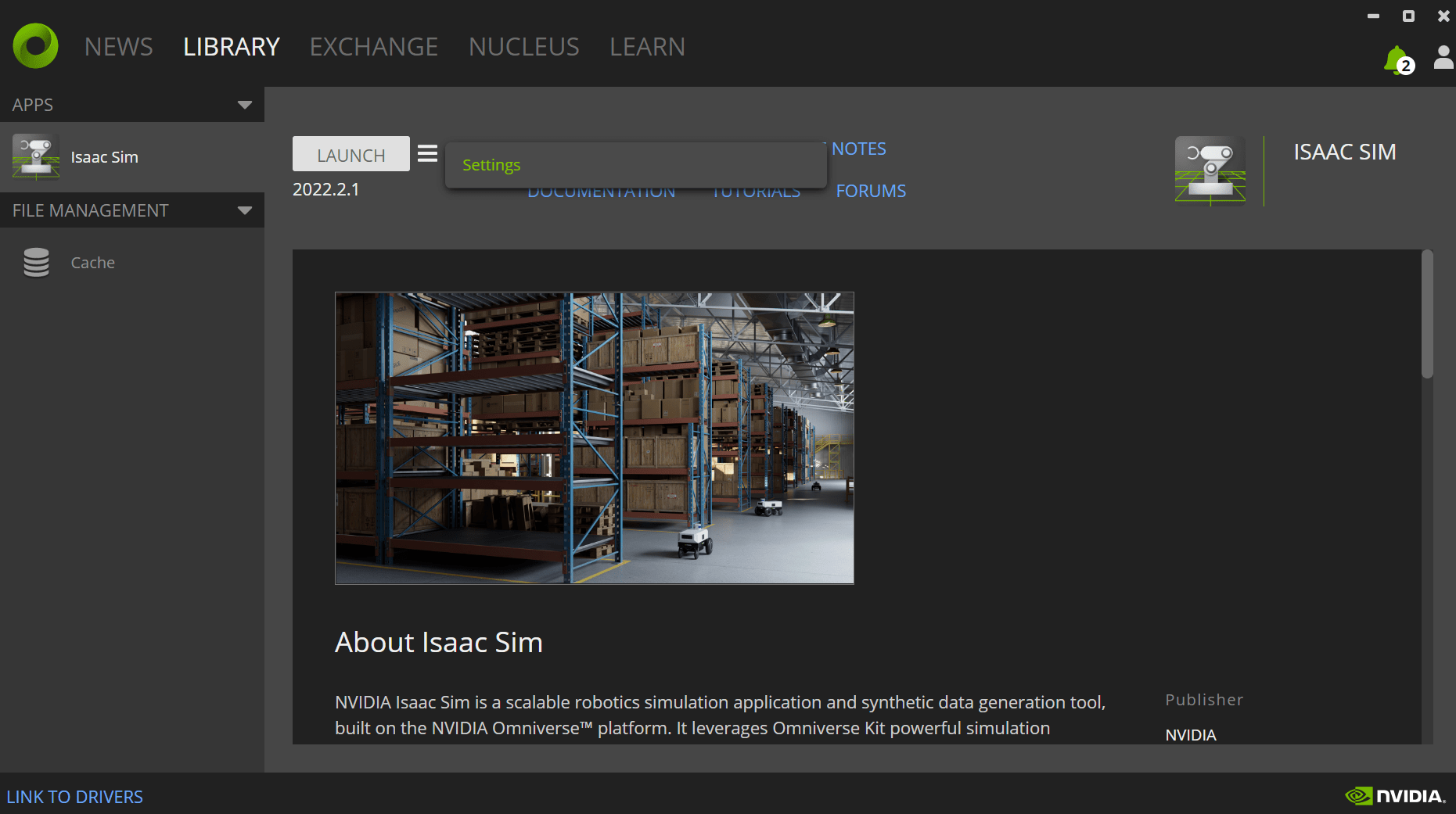 1. Go to the Library tab in the Omniverse Launcher. Select Isaac Sim in the Apps pane on the left.