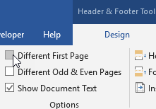 Under Header and Footer Tools, on the Design tab, clear the Different First Page check box.