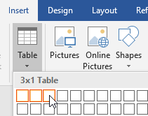 On the Insert tab, Click Table. Move the pointer over the grid until you highlight three columns and one row.