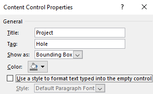 6. On the Developer tab, click Properties. In the Content Control Properties dialog box, enter Date in the Title field and Hole in the Tag field.
