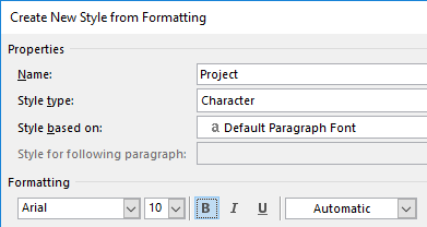 In the Create New Style from Formatting dialog box, enter Project in the Name field. For the formatting, specify Arial, 10pt. Click the Bold button. Click OK.
