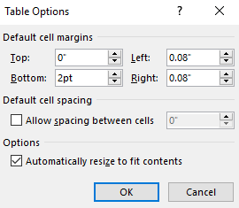 3. In the Table Options dialog box, under Default cell margins, in the Bottom field, enter 2pt.