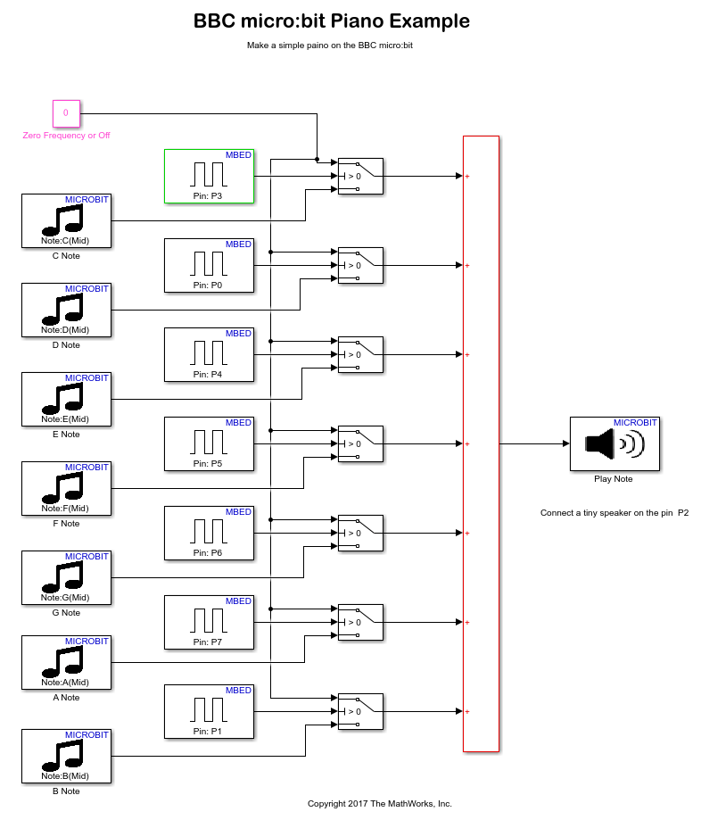 • The Piano Simulink model maps the pins on the BBC micro:bit to particular notes, and the note is played if you short the pin to the GND (ground) pin.
