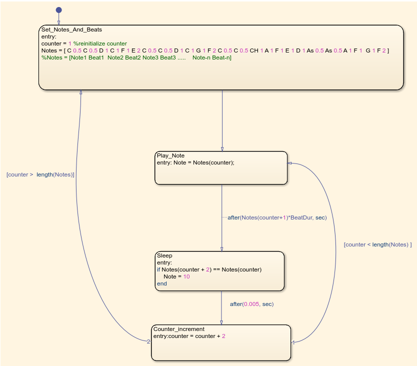 Once the array is entered, the next state, Play_Note, plays a single note. For the example array mentioned above, the note A is sent out of the stateflow first. This note is played for 1 beat, and a counter is incremented. The next note, B, goes is played for 0.5 beats.