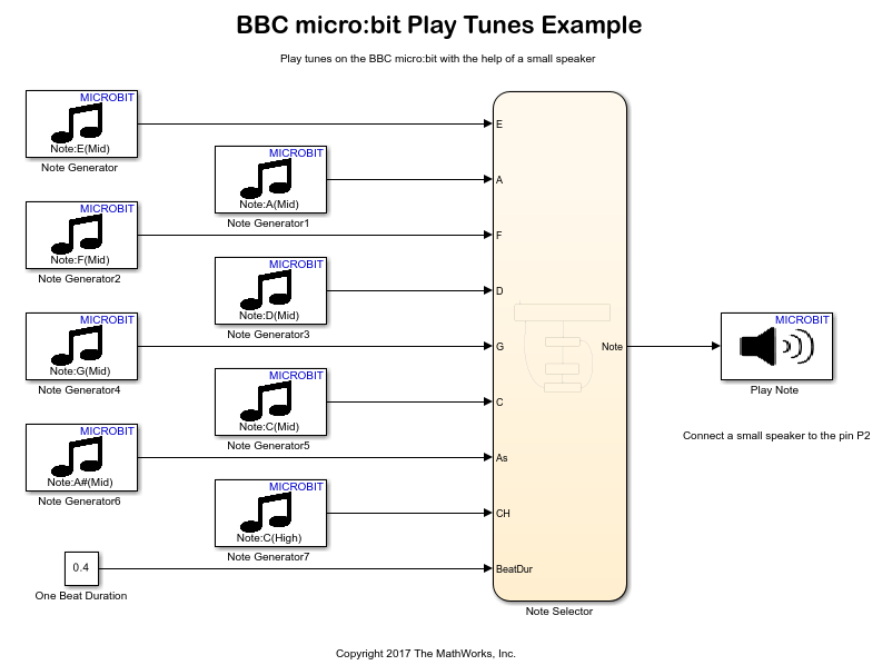 The Simulink® Coder Support Package for BBC micro:bit provides Audio blocks that help you to generate musical notes and play them.
