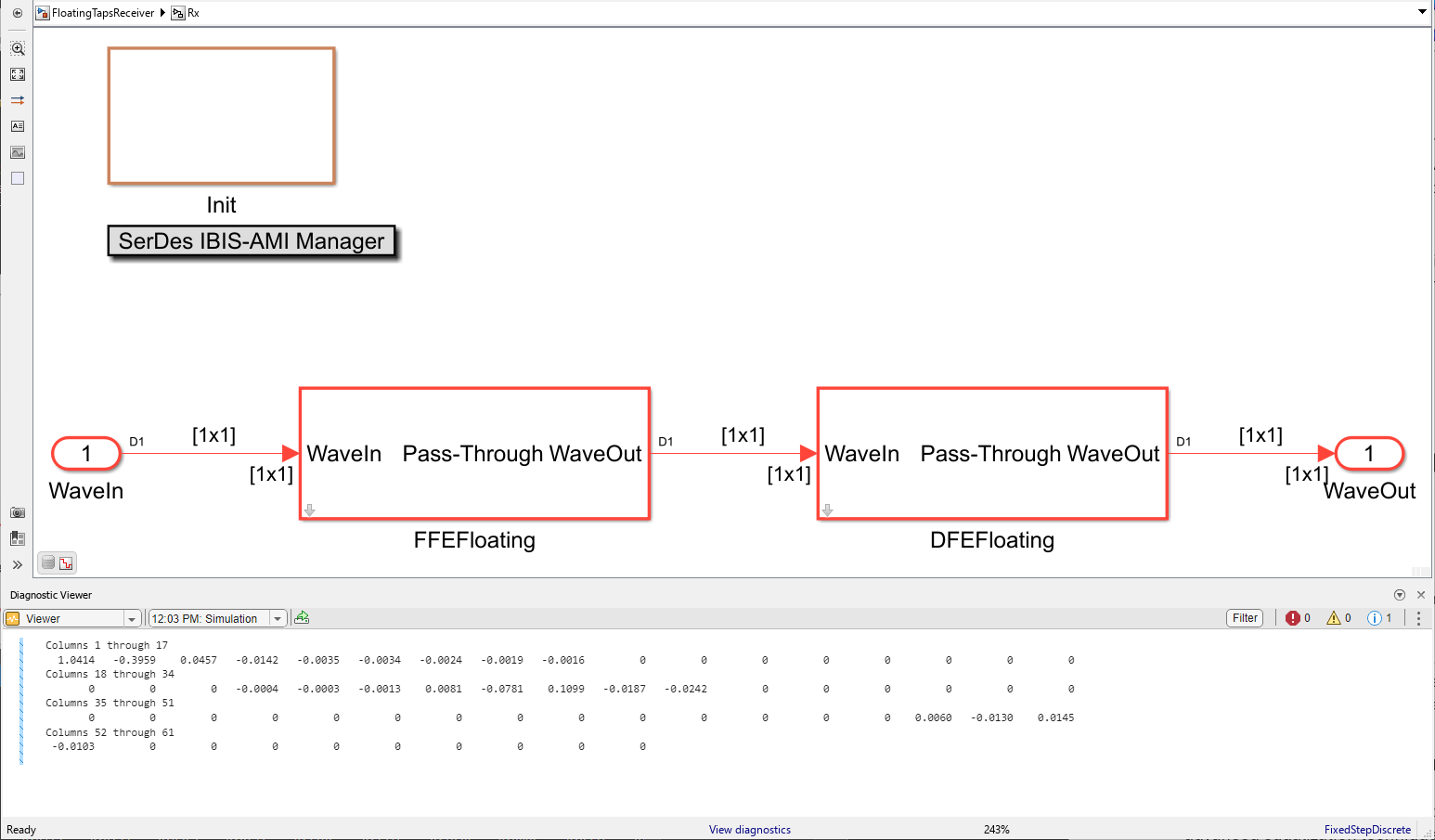 Open the model FloatingTapsReceiver attached with this example. The model is pre-configured with both the FFE and DFE in the Rx. Both FFE and DFE are set up inside individual PassThrough blocks and connected to a set of IBIS-AMI parameters controlling Mode and Tap Weights. For more information on how to configure custom blocks, see Implement Custom CTLE in SerDes Toolbox PassThrough Block examples.