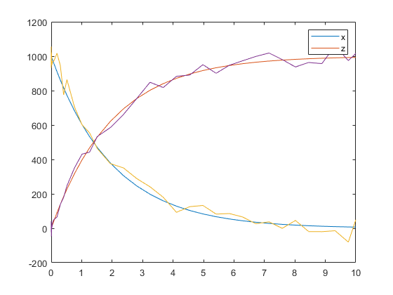 This example adds noise (or error) to the simulation data from a radioactive decay model with the first-order reaction: dzdt=cx, where x and z are species and c is the forward rate constant.