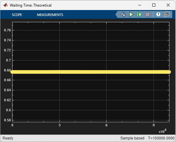 Waiting Time: Theoreticalplots the theoretical values of mean waiting times in the queue that is calculated by theCompute Theoretical Waiting Timesubsystem. This subsystem receives the arrival rate as input from the Knob block, and calculates the theoretical mean waiting time as:
