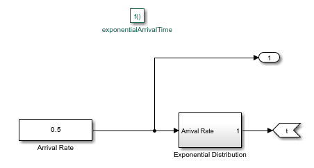 where exponentialArrivalTime() represents the output of the Simulink Function block with the same name.