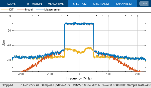 Thie second Simulink testbench shows how to linearize the PA model, including an adaptive digital predistortion algorithm. The output signal is compared with the measured waveforms including iterative direct DPD and the original data. This example uses a time domain scope to verify that the input voltage of the PA does not exceed the dynamic range over which it was characterized. For this example, the maximum input voltage of the data used to identify the PA model was 0.6 V, therefore this limit should not be exceeded when simulating the PA model together with the DPD algorithm. Exceeding the characterization range will lead to incorrect results, as well as potential convergence issues.