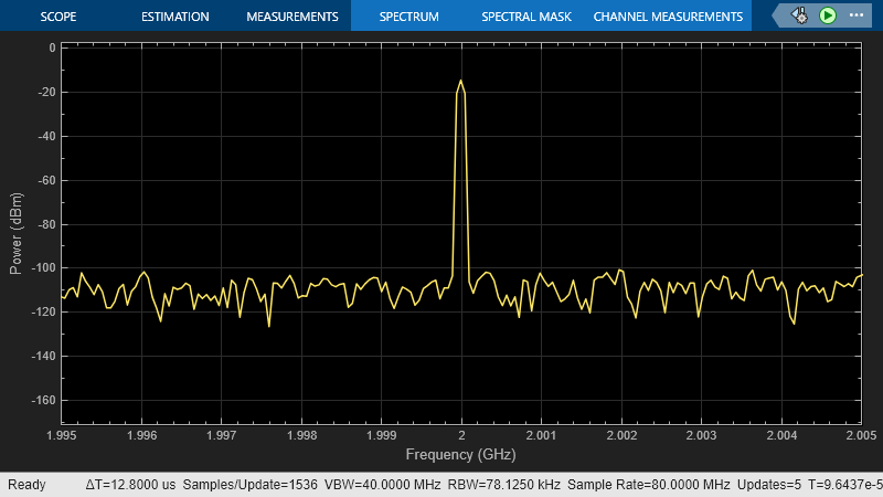 Run the model. You will see that the display shows a transducer gain value of 15 dB. This can be calculated using the equation, Transducer gain of the DUT = Available power gain of Amplifier + Available power gain of Mixer = 10 dB + 5 dB = 15 dB.